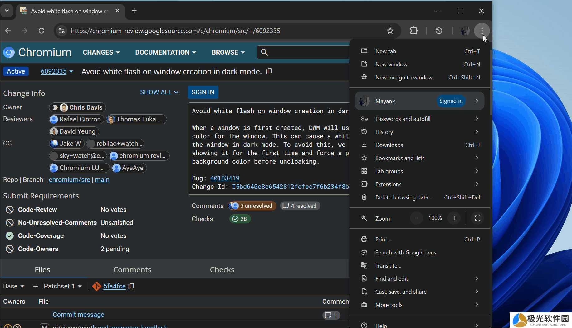 不过,这一问题即将得到解决。浏览器研究员 Leo 在 X 发现,微软已经为 Chromium 提交了补丁,旨在消除深色模式下窗口创建时的白屏问题。