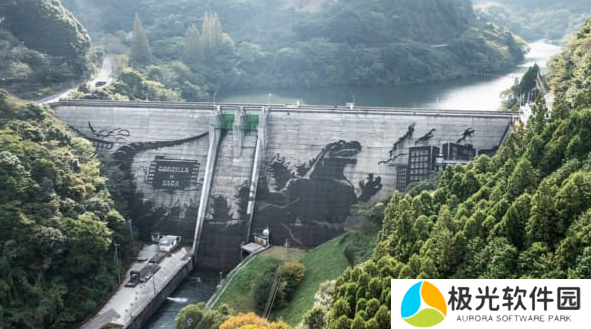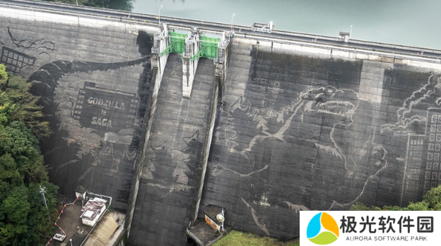 位于日本佐贺县的一座岩屋川内水库大坝日前成了县内新打卡热点,原来这里的大坝侧面惊现哥斯拉大壁画,如果离近了你才会发现是人工打造的结果。