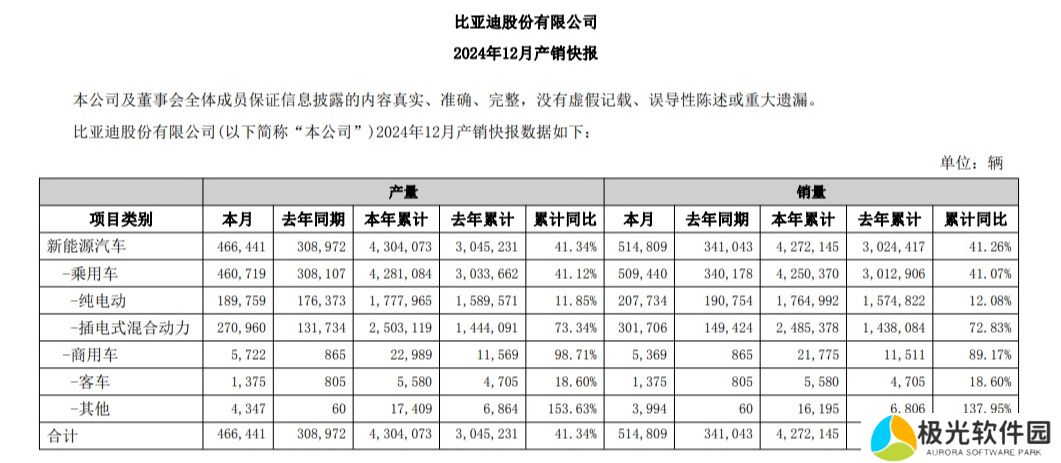 比亚迪 2024 年全年新能源汽车销量达 4,272,145 辆,累计同比增长 41.26%。