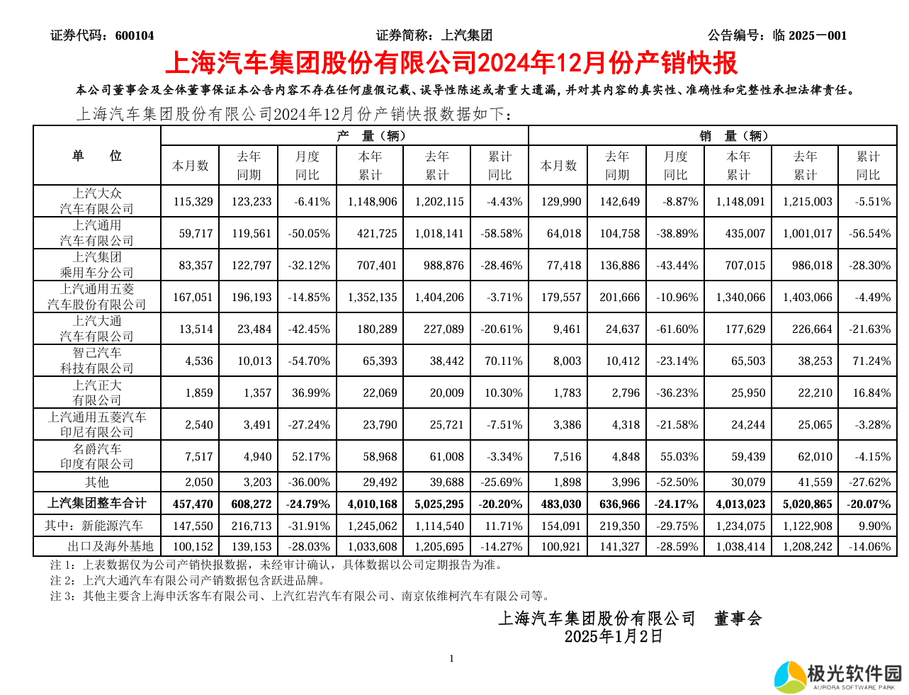 上汽集团:2024 年整车合计销量 401.3 万辆,同比下滑 20.07%。