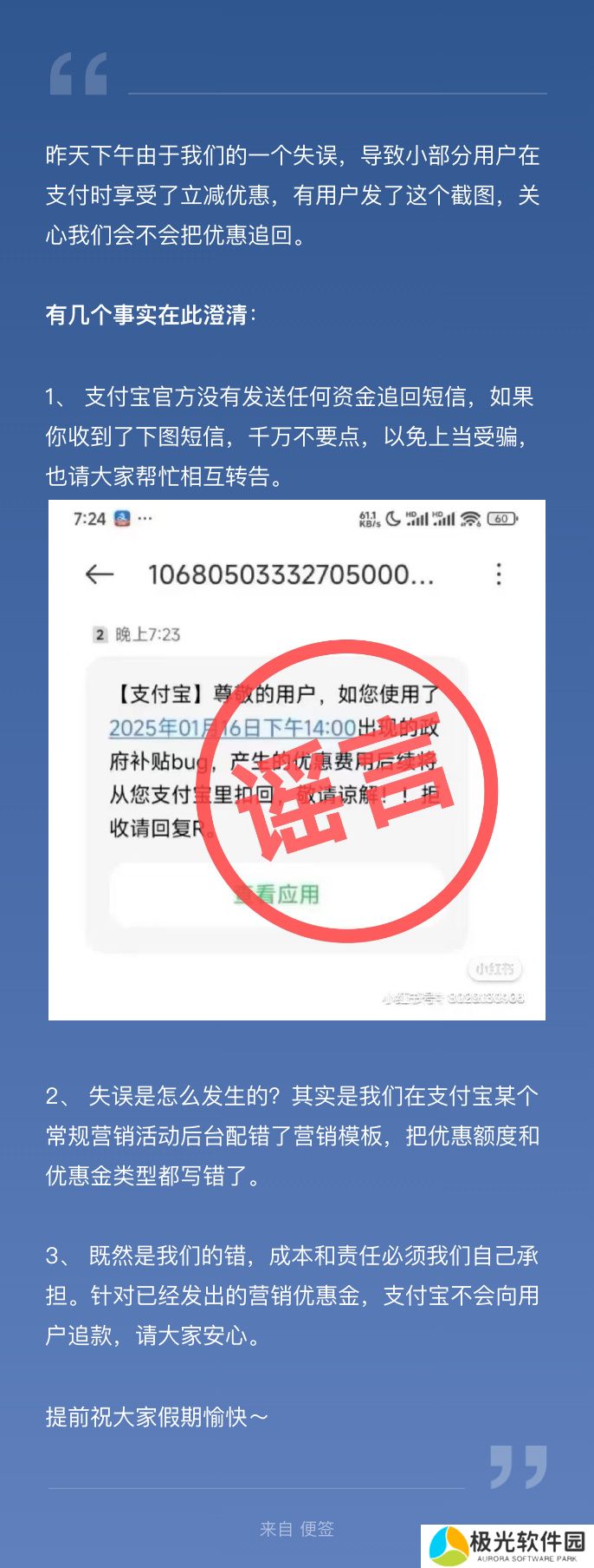本站 1 月 17 日消息,支付宝今日凌晨发文称:“昨天下午由于我们的一个失误,导致小部分用户在支付时享受了立减优惠”。为此,支付宝进行了几个事实澄清。