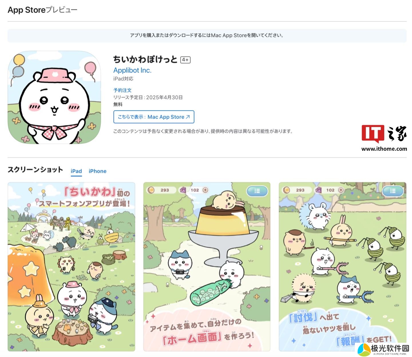 本站1 月 31 日消息,《吉伊卡哇(ちいかわ)》是漫画家长野创作的漫画系列,自2020年1月开始连载,2022年4月改编为动画,而后被改编为手游《Chiikawa Pocket /ちいかわぽけっと》,这款手游原定明天发售,不过目前已跳票至 4 月 30 日发售,本站附苹果 App Store 商店链接如下(点此访问)(注:暂锁日服)。