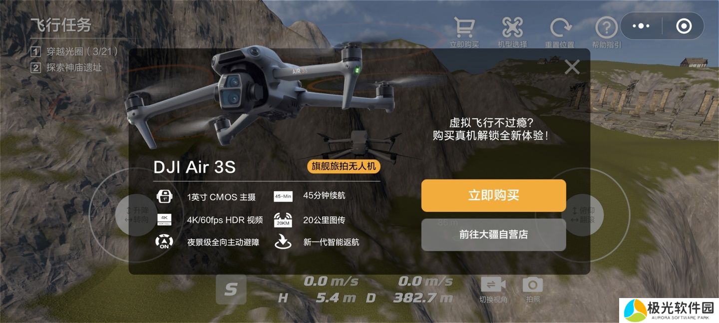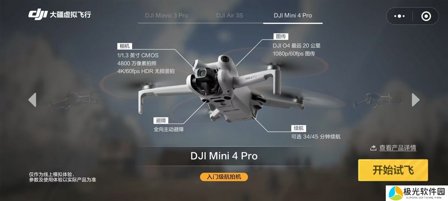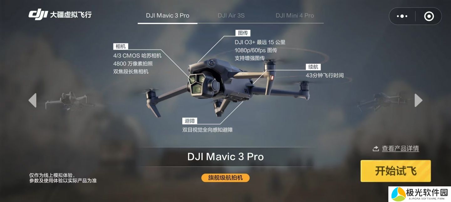 目前,该虚拟飞行小程序中可选 DJI Air 3S、DJI Mini 4 Pro、DJI Mavic 3 Pro 三款无人机,除了“一键试飞”外,用户也可以点击购买直接跳转至大疆小程序下单无人机。