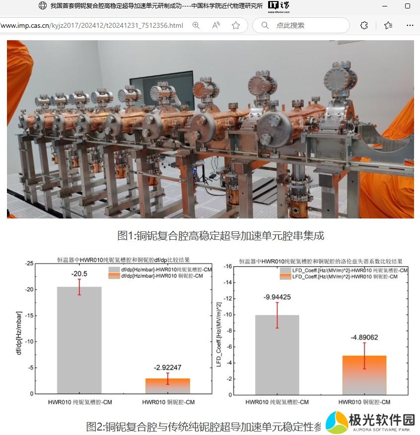 本站 1 月 1 日消息,据中国科学院近代物理研究所消息,由该所自主研制的我国首套铜铌复合腔高稳定超导加速单元成功通过各项测试研制成功,标志着我国面向高可靠应用的铜铌复合超导腔技术研究取得突破性进展。