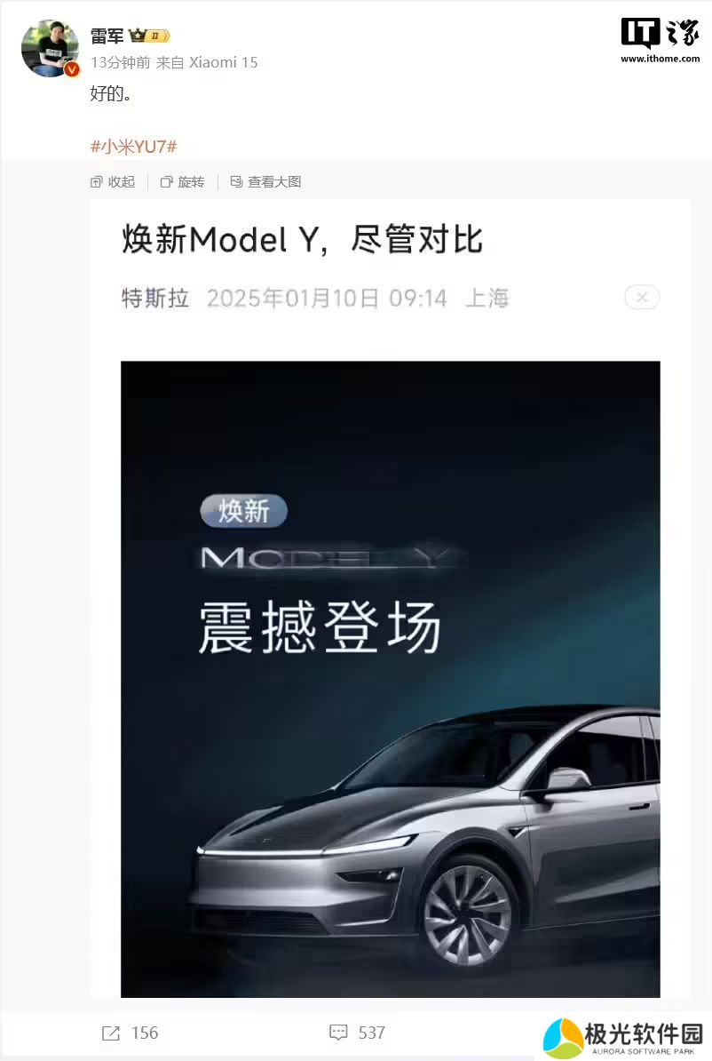 特斯拉焕新 Model Y 正式发布后,官方公众号宣传语为“焕新 Model Y,尽管对比”。对此,雷军发布微博称“好的”。