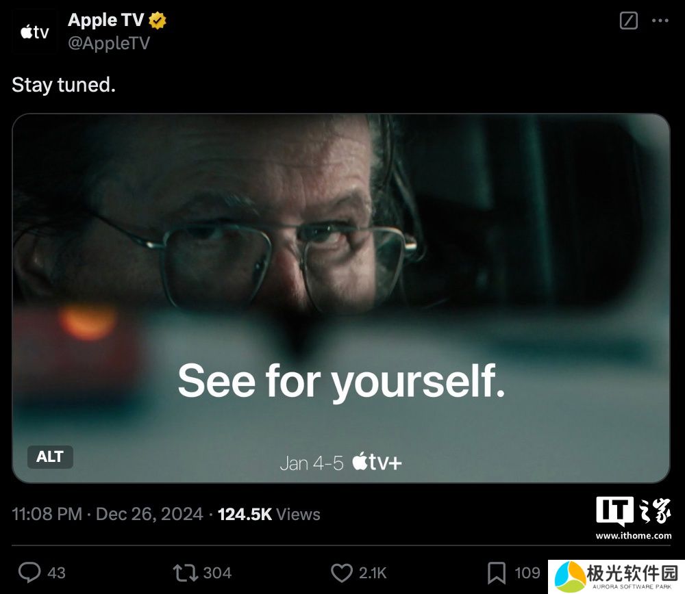 本站 12 月 27 日消息,苹果公司在X平台发文,官宣将于 2025 年(明年)1月4日至 1月5日为Apple TV+服务带来“新惊喜”,不过目前对于具体惊喜内容还不得而知,外媒MacRumors认为这可能是苹果公司将推出Apple TV+限免活动,或是Apple TV+ 2025年节目内容的预告。