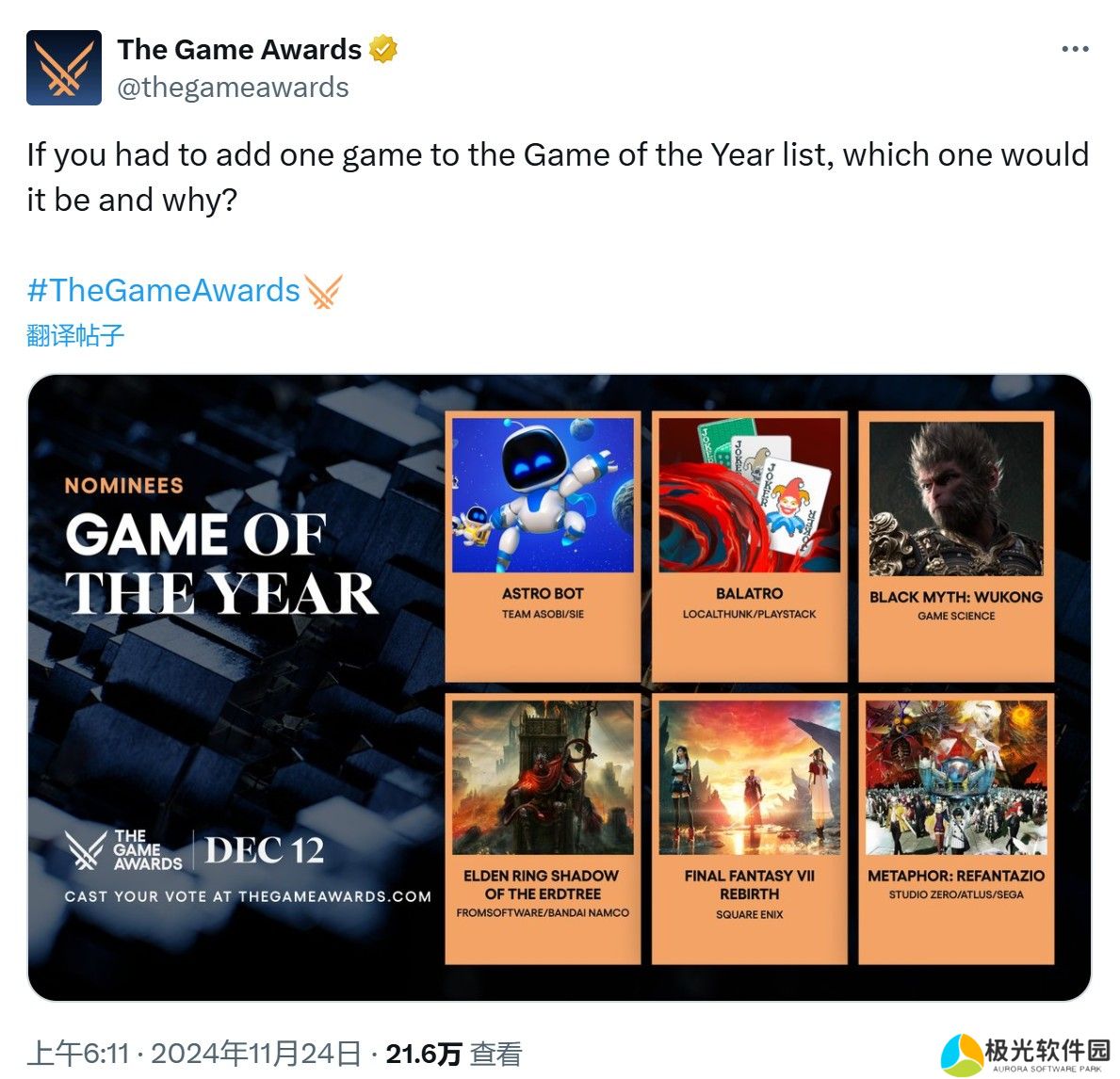 TGA官方整活来了。刚刚,TGA官推发布了一个类似小调查的推文,询问玩家如果必须在年度游戏提名榜单中多加一个,你会选择哪一个游戏?