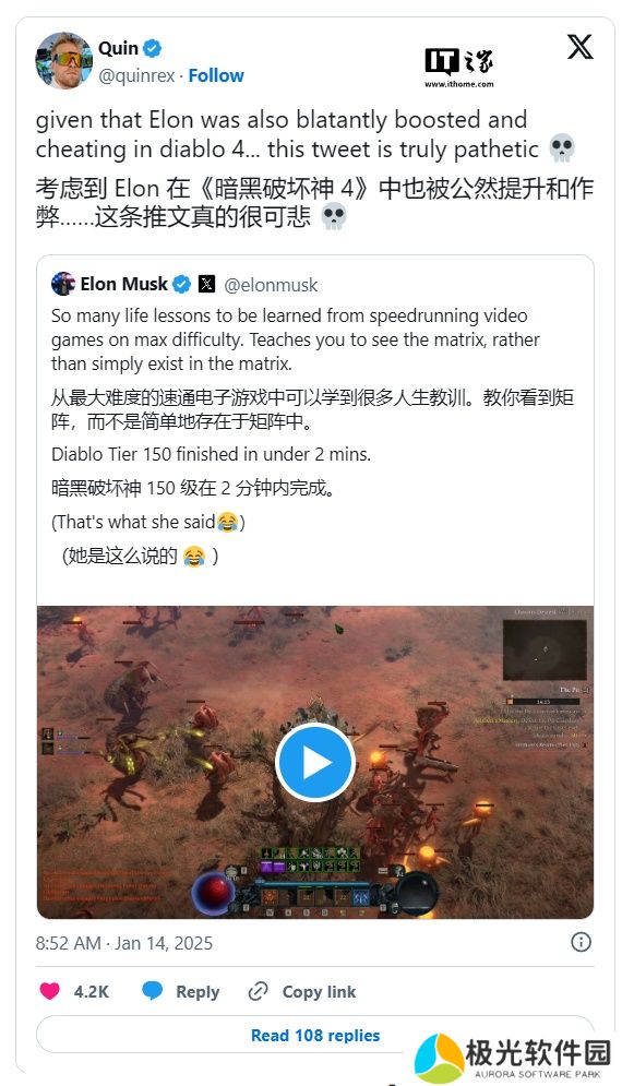 然而,许多玩家对此表示怀疑,认为他可能借助了外部帮助。知名《流放之路 2》主播 Quin69 此前曾公开指控马斯克雇佣他人代练账号,即通过账号共享让他人完成困难部分的操作,而自己只需登录享受成果。针对马斯克的炫耀,Quin69 再次重申了这一指控,并称其推文“实在可悲”。