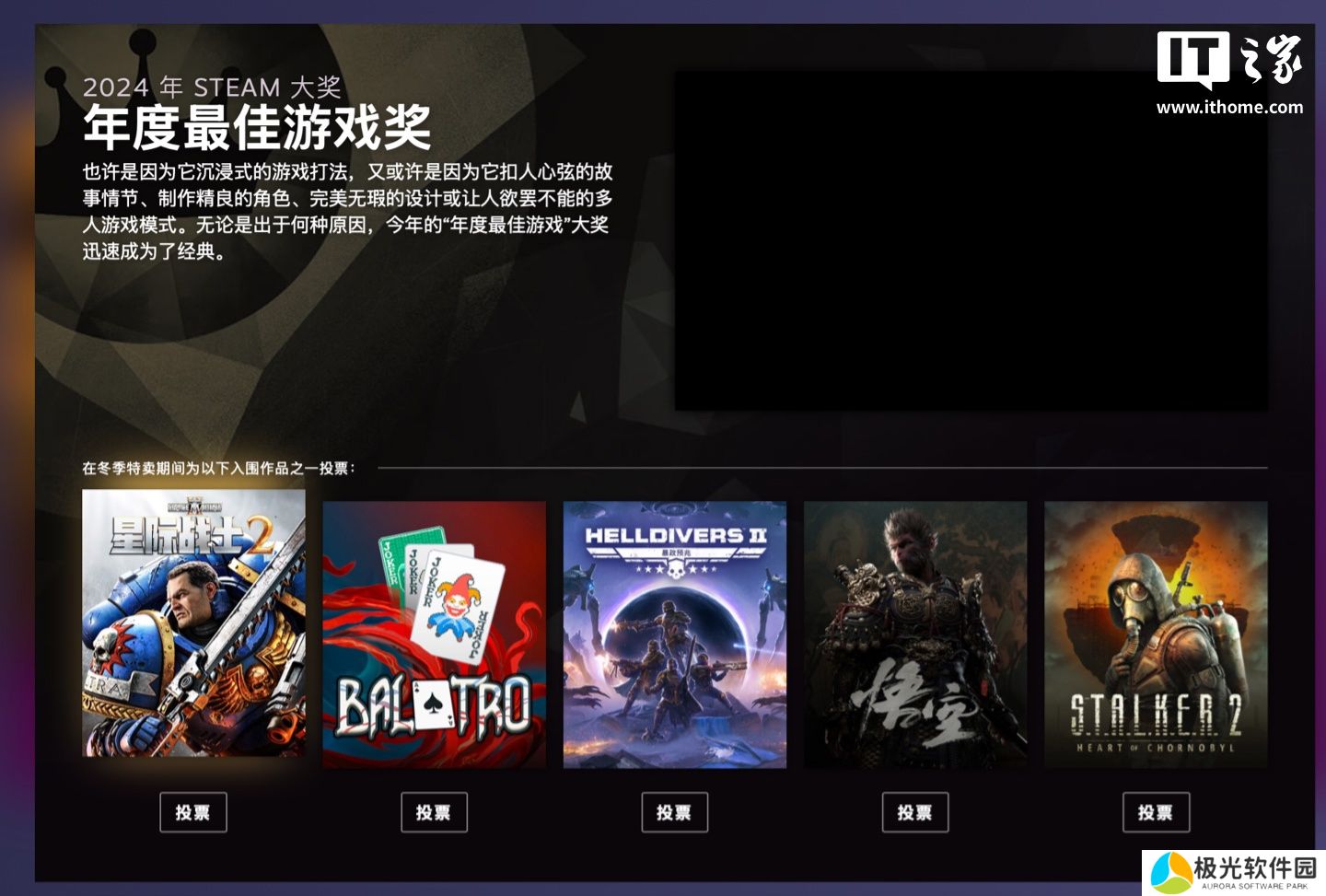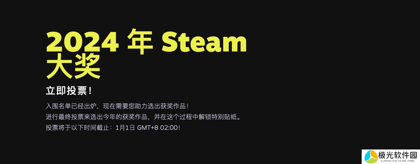 此外,2024 年 Steam 大奖现已开通投票通道,投票过程中可解锁贴纸,最终结果将于北京时间 1 月 1 日凌晨 2 点公布。
