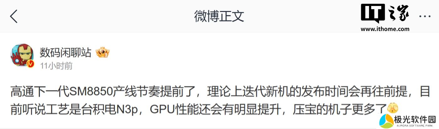 本站注:SM8750 为高通骁龙 8 至尊版(8 Elite),预计 SM8850 为第二代骁龙 8 至尊版。