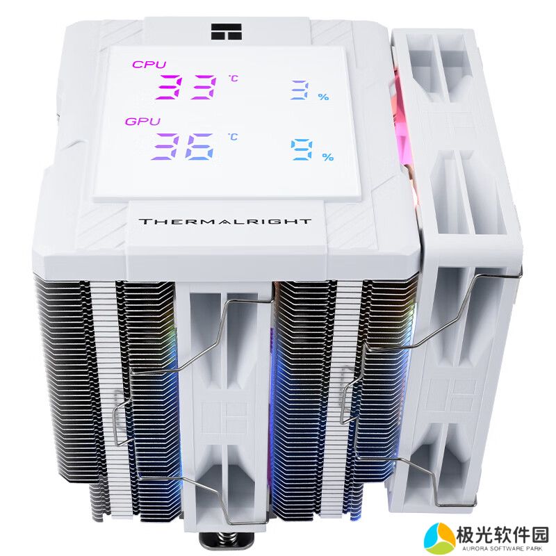 该散热器塔体高 162mm,覆盖双塔和中间风扇顶部的四路 ARGB 数显盖板可同时显示平台 CPU、GPU 的温度和利用率。