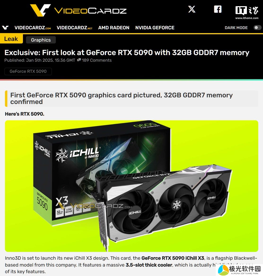 本站 1 月 6 日消息,外媒 VideoCardz 今日曝光了 Inno3D(映众)即将推出的全新设计 iChill X3 系列显卡 ——GeForce RTX 5090 iChill X3,这是该公司基于 Blackwell 架构的旗舰产品,配备了一款厚达 3.5 插槽的巨大散热器。