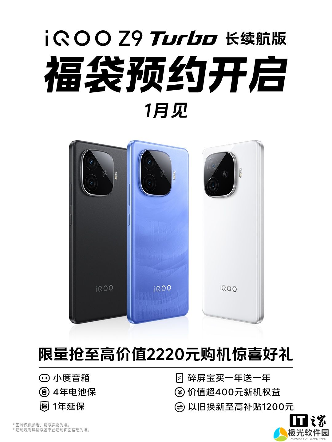 从海报中可以看到,iQOO Z9 Turbo 长续航版有黑、白、蓝三色可选。官方昨日称这款新机的电量和续航时长将更进一步。在 vivo 官网预约购机用户将获赠小度蓝牙音箱灵动版。