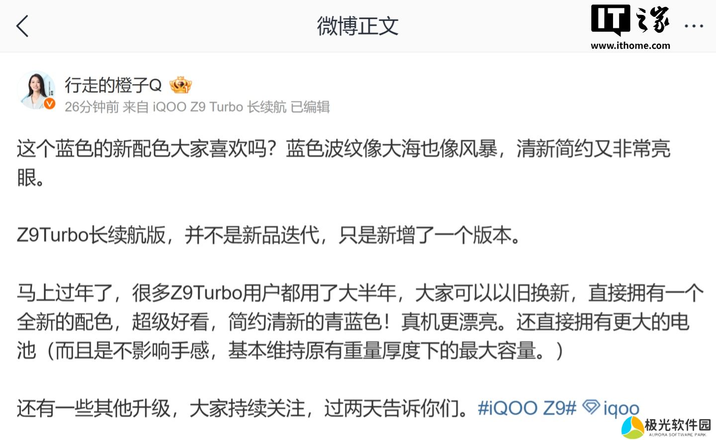 本站 12 月 23 日消息,iQOO 手机官方今日宣布,iQOO Z9 Turbo 长续航版手机开启预约,1 月见。