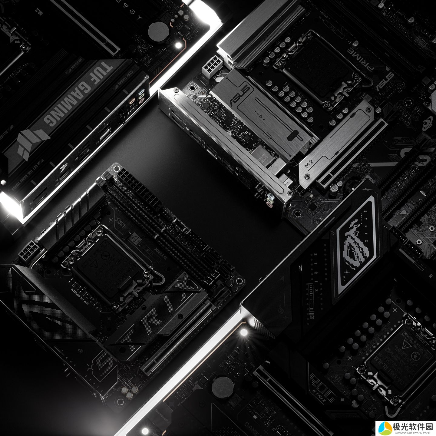 本站注意到,华硕海报中包括至少四款新品,包括PRIME 大师系列、TUF Gaming 电竞特工和 ROG STRIX 猛禽系列,左下角这款似乎还是一款 ITX小板。