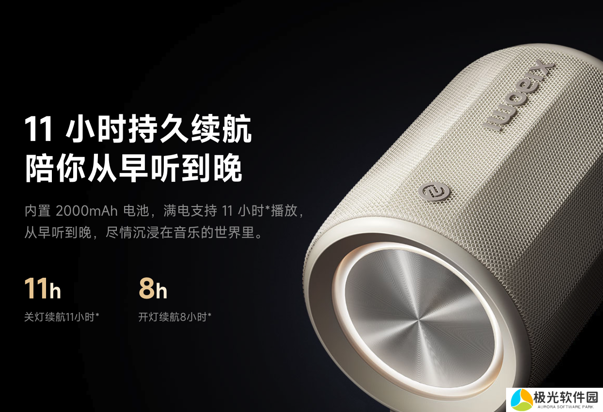 该音箱内置 2000mAh 电池,支持 1.8 小时内充满,关灯满电支持11 小时播放。