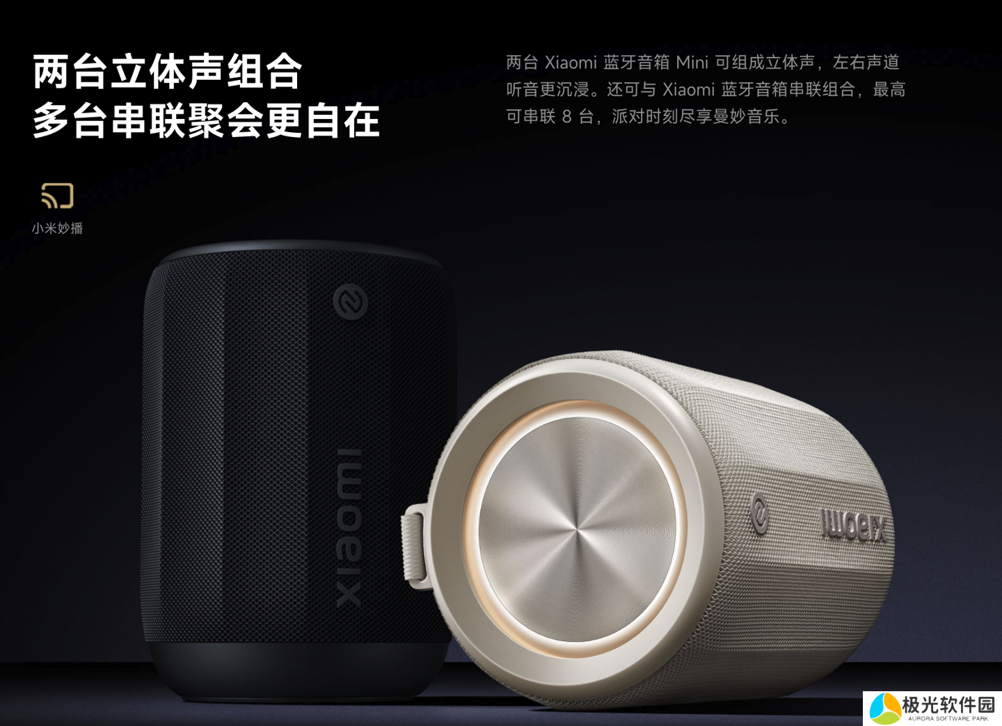 小米蓝牙音箱 Mini支持小米澎湃智联、支持两台组立体声,最高 8 台串联播放,顶部 RGB 氛围灯带支持米家 App 自由调色。