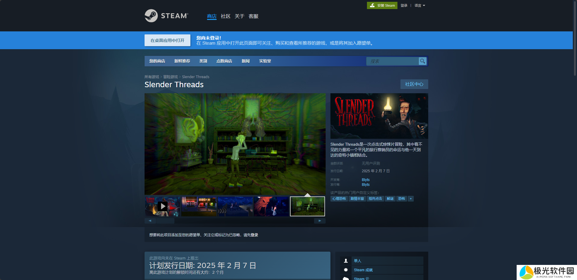 Steam平台需要先安装Steam平台,之后注册一个账号登录,然后搜索“Slender Threads”进入商店购买页面。