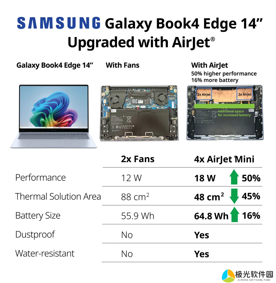 这一改变减少了 45% 的散热系统占用空间,释放了内部空间,从而将电池容量从 55.9Wh 增加到 64.8Wh,使视频播放时间延长 16%,从 20 小时提高到 23.2 小时。AirJet 系统还无需风扇进气孔,从而实现了更时尚、防尘和防水的设计,同时保持了 10.9 毫米的超薄机身。与 MacBook Air 15 相比,搭载 AirJet 的 Galaxy Book4 Edge 14 提供了更卓越的性能和电池续航,持续功率高出 50%,视频播放时间长 29%。