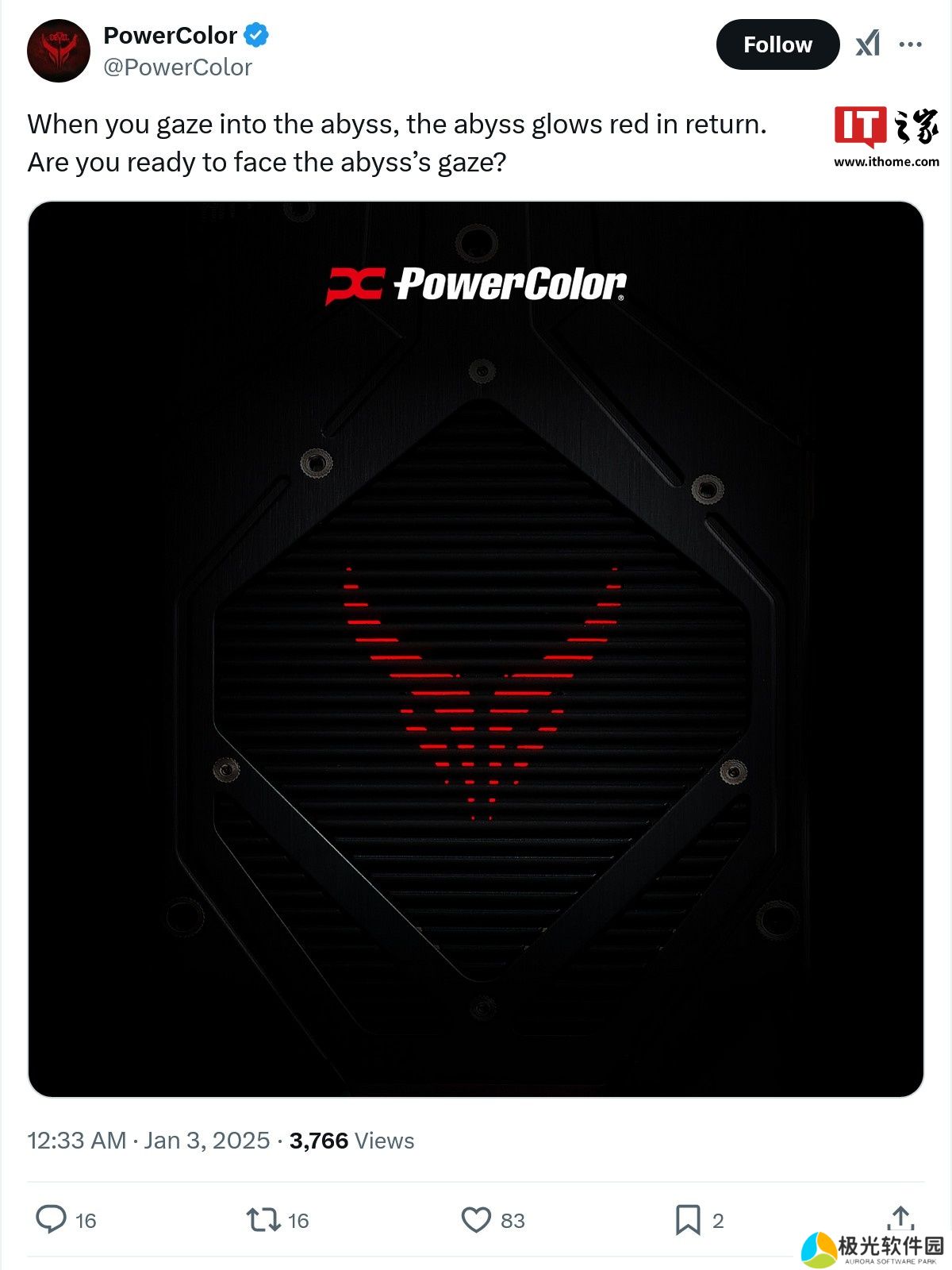 本站 1 月 3 日消息,老牌 AMD 显卡 AIB 合作伙伴撼讯 PowerColor 北京时间今日凌晨在 X 平台对新款 Red Devil“红魔”系列旗舰显卡进行预热。可以看到图片以黑色为底色,在格栅上点缀以 Red Devil 红色徽标。
