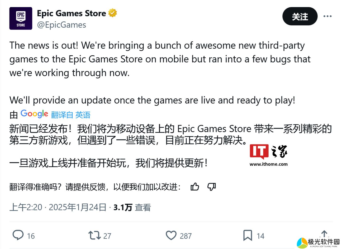 本站 1 月 24 日消息,科技媒体 The Verge 今天(1 月 24 日)发布博文,报道称 Epic Games 在其移动应用商店中,扩充添加了 19 款第三方游戏,并承诺承担开发者部分“核心技术费”,以吸引更多用户和开发者。