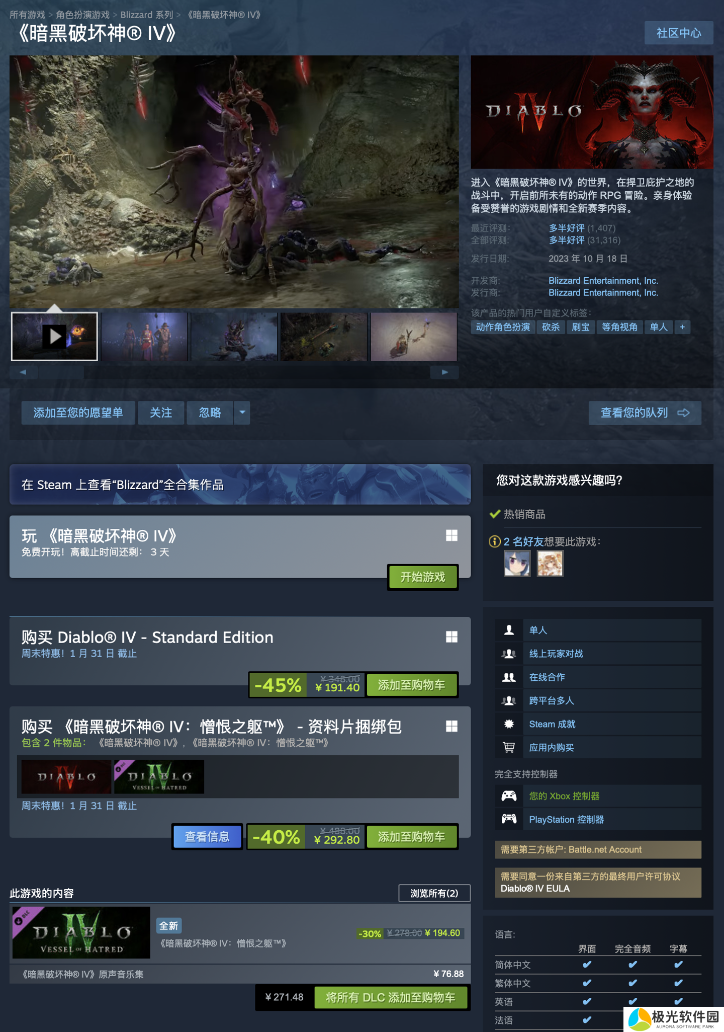 据悉,本作在Steam平台好评率为71%“多半好评”,游戏完全支持简繁中文(含界面 / 语音 / 字幕),目前其捆绑了资料片《暗黑破坏神 4:憎恨之躯》的大包也迎来打折,原价为 488 元,6 折后售 292.8 元。