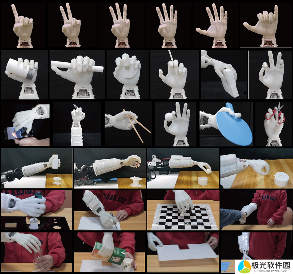 通过与语音识别技术结合,假肢灵巧手具备简单、友好且低成本的人机交互能力,支持 60 种语言和 20 种方言,具备 95% 的识别准确率和毫秒级的响应时间,适于在截肢患者中普及。在临床测试中,一名 60 岁女性截肢患者仅用半天便熟练掌握该假肢灵巧手的使用,成功完成了多项标准假肢手功能评估实验中的代表性任务,包括南安普顿手功能评估程序(SHAP)和沃尔夫运动功能测试(WMFT)。值得一提的是,该假肢灵巧手还展现了操作剪刀、使用手机以及完成复杂的手语手势的能力,完美复现传统的 33 种人手抓握动作,还能够完成 6 种更高难度的新抓握动作,使用场景丰富(图 2)。该假肢灵巧手具有极强的工程应用前景,可为人形机器人灵巧操作及高性能假肢手研究提供有效的解决方案。