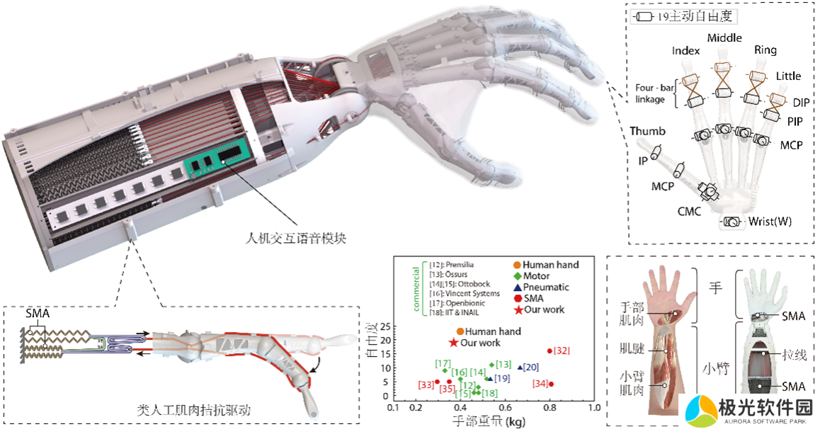 人手具备 23 个自由度,重量仅为人体重量约 1/150,但运动功能占全身运动功能的 54%,是体现人类以及人形机器人工作能力的关键部件。然而,现实中,包括人形机器人的灵巧手以及全球超过一千万名上肢截肢患者的假肢手应用面临挑战。传统假肢灵巧手通常使用电机驱动,功率密度低,难以在自由度与重量之间找到理想平衡:佩戴超过人手重量(0.4 千克)的灵巧手会让患者感到严重不适,而自由度较低(通常少于 10 个)灵巧手仅能实现有限的抓握动作,远不及人手的灵活性。这些限制导致接近一半的假肢灵巧手被患者放弃使用。因此,兼顾高自由度灵巧运动和舒适佩戴的设计方法是假肢灵巧手领域的重要科学问题之一。