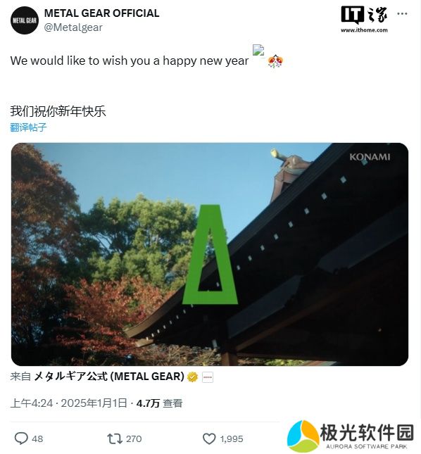 科乐美今天发布了一段以《合金装备 3:重制版》(《合金装备 Δ 食蛇者》)Logo 为开头的 2025 年新年祝福视频,并以“2025 年是蛇年”作为结尾,确认这款游戏将在今年发售,这也是官方首次提及该作的潜在发售时间。