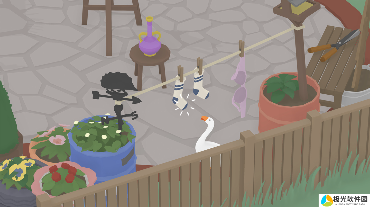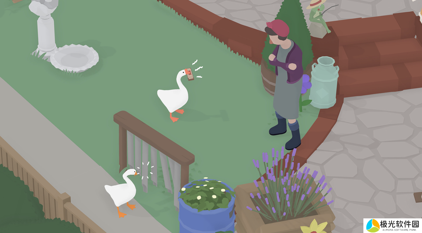 Untitled Goose Game是一款偷袭式闹剧风格的开放式游戏,你在游戏里是一只鹅,让原本清静的村庄心神不宁。在小镇上四处游荡,从后院到街头店铺,再到村里的绿地,搞恶作剧、偷帽子、嘎嘎叫,毁掉所有人一天的生活。