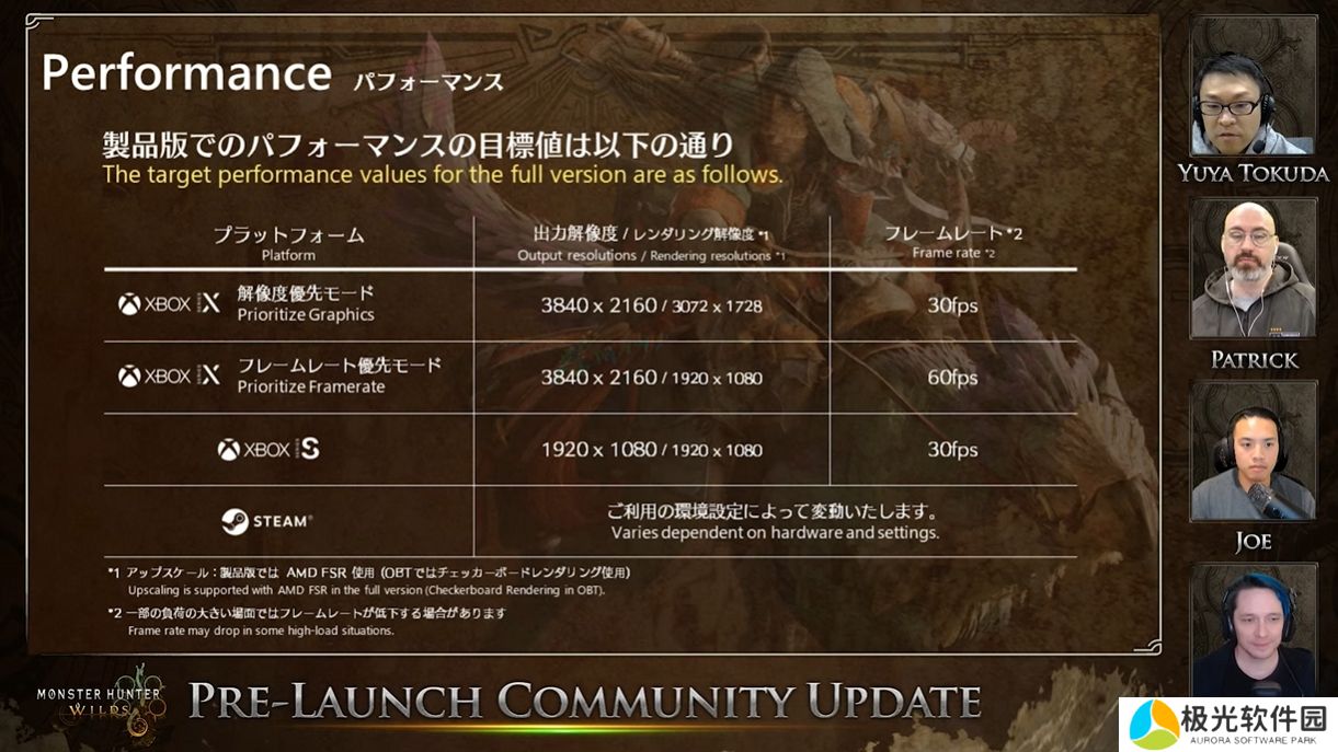 性能方面,公开了各主机和 PC 的目标值。此外,还透露将在发售当天发布的 Day1 补丁中支持“PS5 Pro Enhanced”,并为 PC 版准备了基准测试软件。