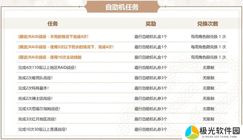 除了幸运摩天轮可转动外,趣行自助机活动也在火热进行中,参与其中也是可以收获丰厚奖励的!在12月17日维护前,英雄们每周可通过角色邮箱获得20个趣行自助机硬币,使用硬币可以在自助机兑换任务,英雄们可以选择自己比较有把握或是感兴趣的任务,完成这些任务就可以获得能兑换到各种道具的礼券啦!