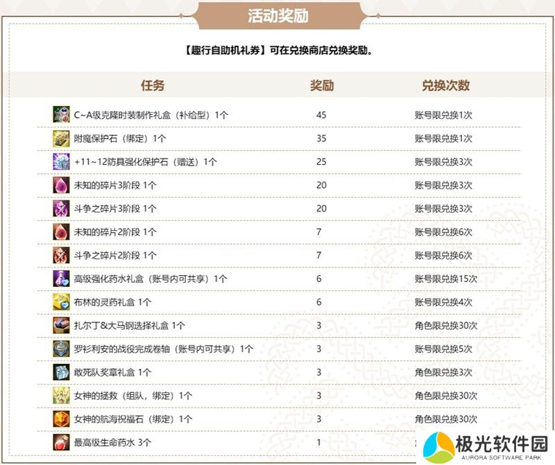 其中就有C~A级克隆时装制作礼券(补给型)、附魔保护石等各种实用且高价值的道具,不过每种道具都是有兑换条件与次数限制的,大家可以根据自己的需要分配哦!