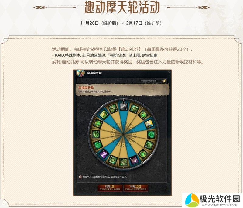 在11月26日维护后至12月17日维护前,英雄们完成Raid、特殊副本、红月地区战役、尼福尔海姆、骑士团、时空扭曲战役,就可获得趣动礼券(每周最多可获得20个),消耗礼券就能转动摩天轮获得奖励啦!奖励包含注入力量的新埃拉材料等可用于提升装备的道具哦!