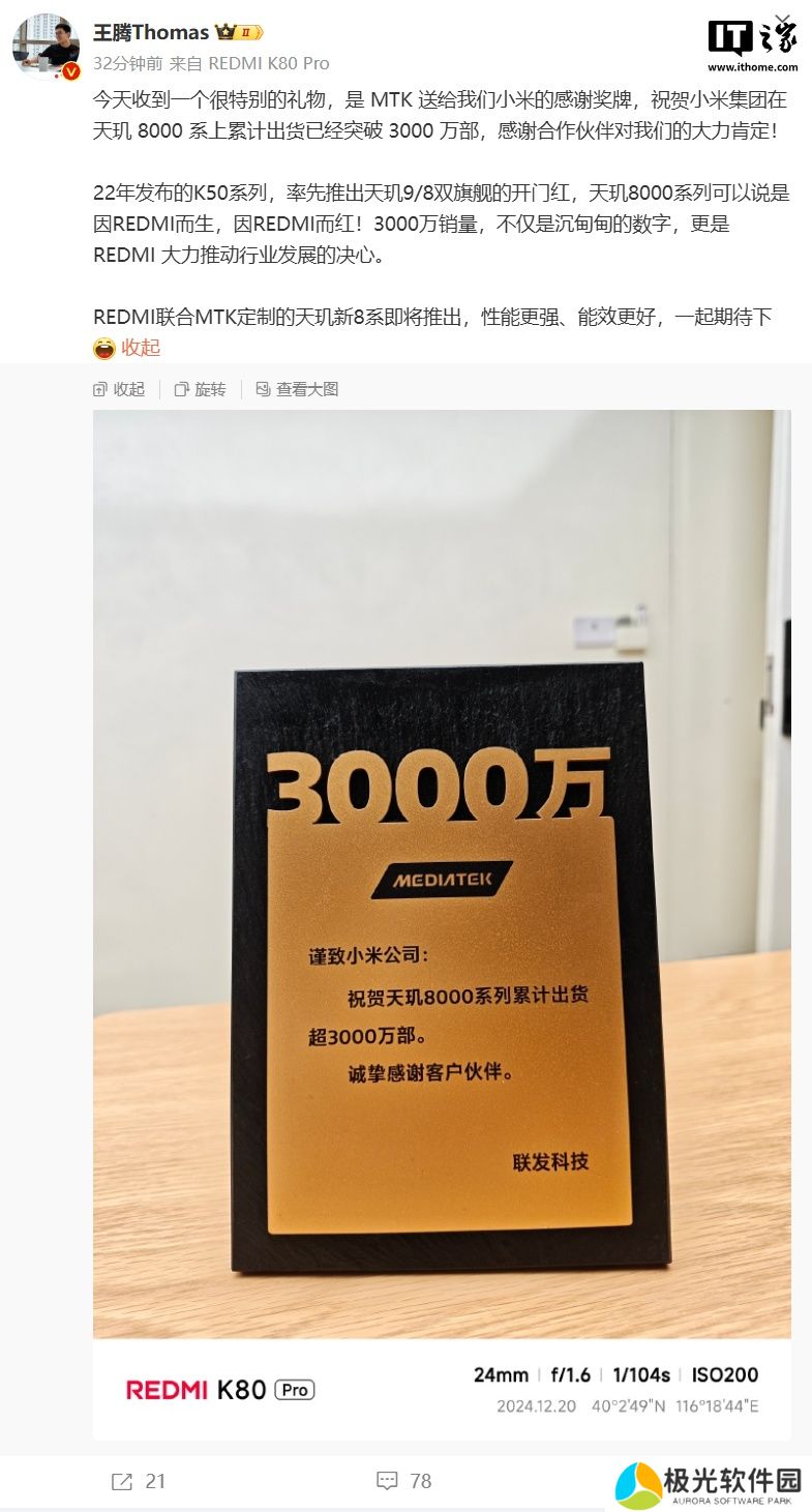 本站 12 月 20 日消息,小米中国区市场部副总经理、REDMI 品牌总经理王腾今日晒出奖牌,小米集团在天玑 8000 系上累计出货已经突破 3000 万部。