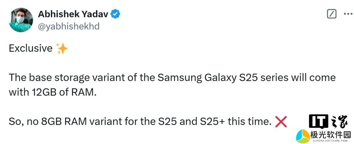 本站 12 月 20 日消息,X 平台博主Abhishek Yadav 今日爆料称,三星 Galaxy S25 系列手机的基础版本将配备 12GB RAM。所以,这次没有 8GB RAM 版本的 S25 和 S25+。