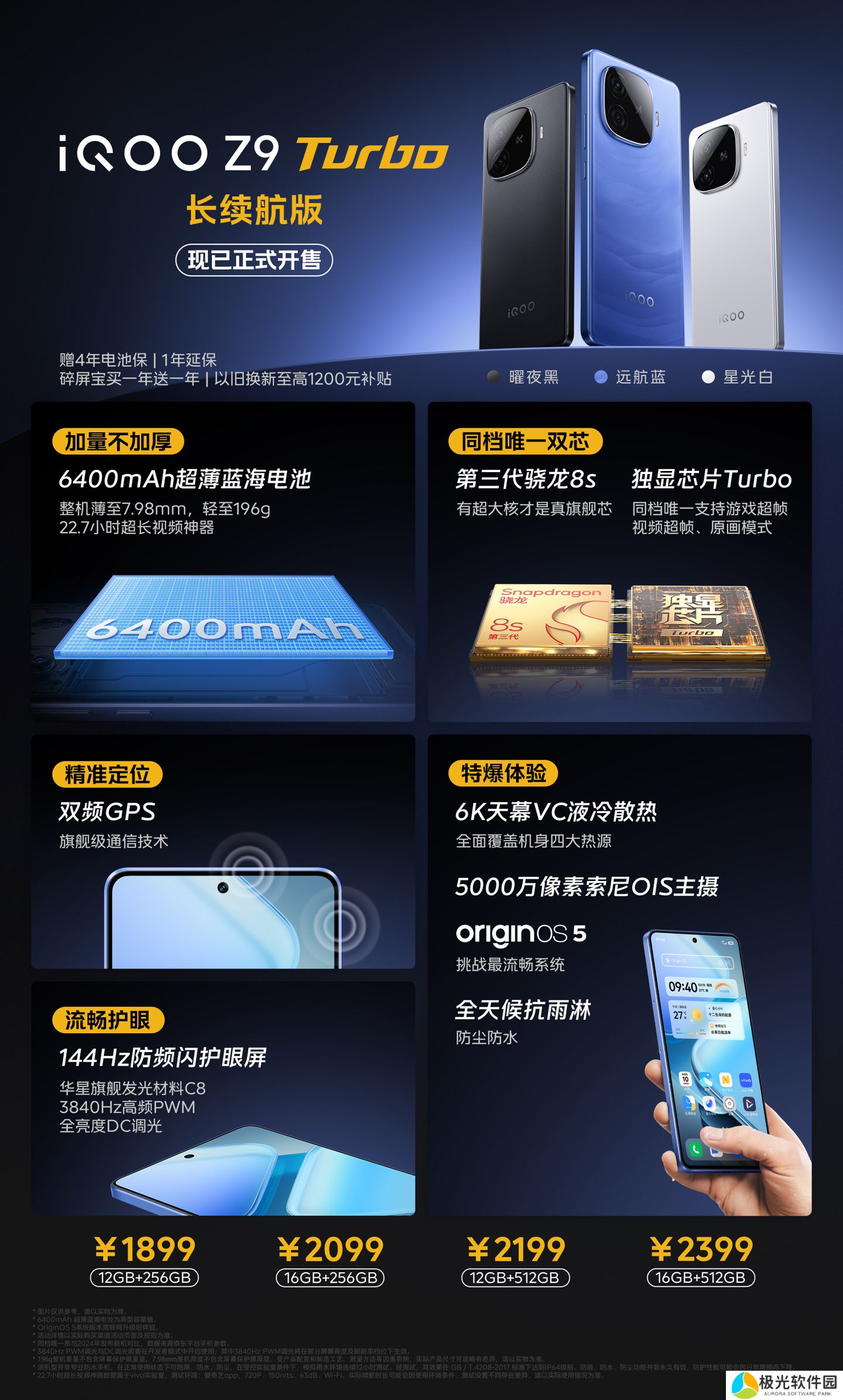 该机并非“正式迭代”,而是 Z9 Turbo 的一个特别版本。其将升级全新的“远航蓝”配色,配备加量不加厚 6400mAh 电池,重量为 196g,搭载独显芯片 Turbo,升级双频 GPS,屏幕为全批次华星 C8。
