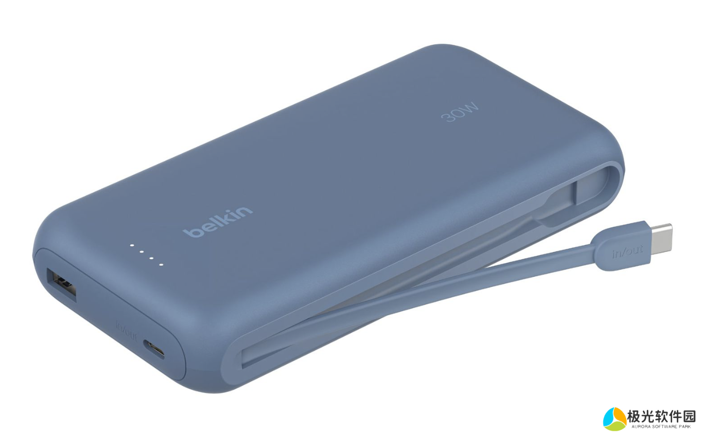 这款自带线移动电源可选黑色、白色、蓝色和粉色,整体容量20000毫安时,自带USB-C线和USB-C + USB-A接口,至高支持30W输出。