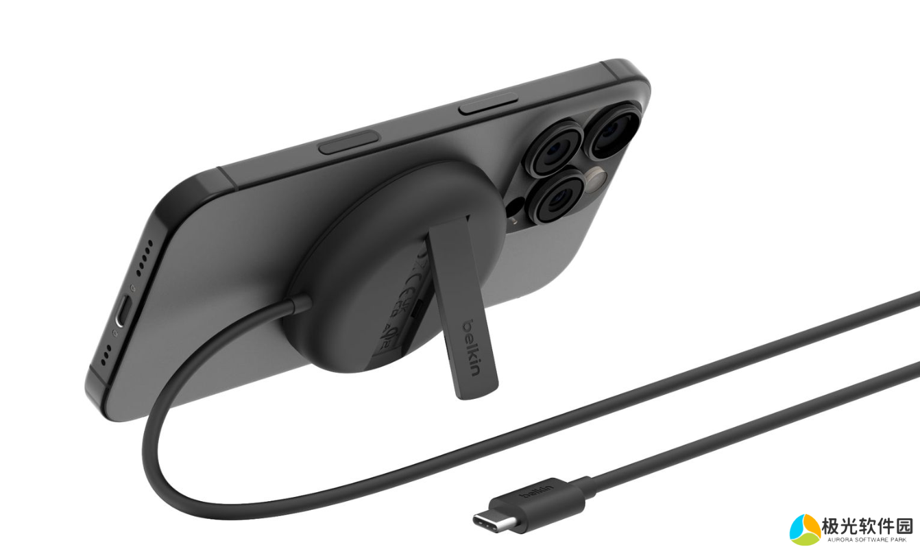这款充电板能够以 15W 的功率为 iPhone 充电,并自带弹出式支架(按下弹出)和一条 2.2 米的 USB-C 充电线。