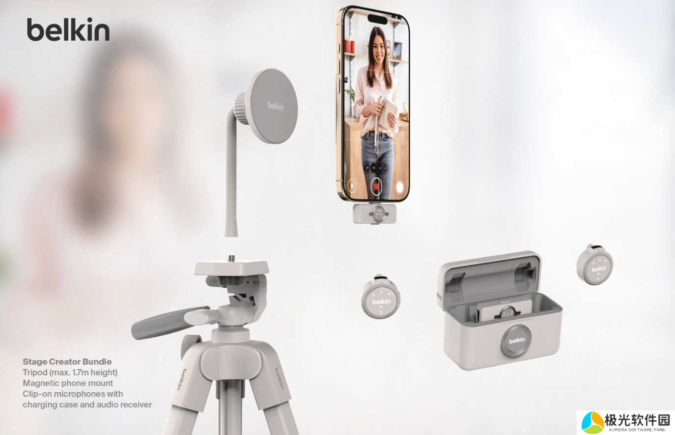 这款创意工具包主要自带一个磁力支架,用于内容创作者进行直播使用,同时包内还配有具有 100 米传输范围的可穿戴夹式麦克风和一条 USB-C 充电线。