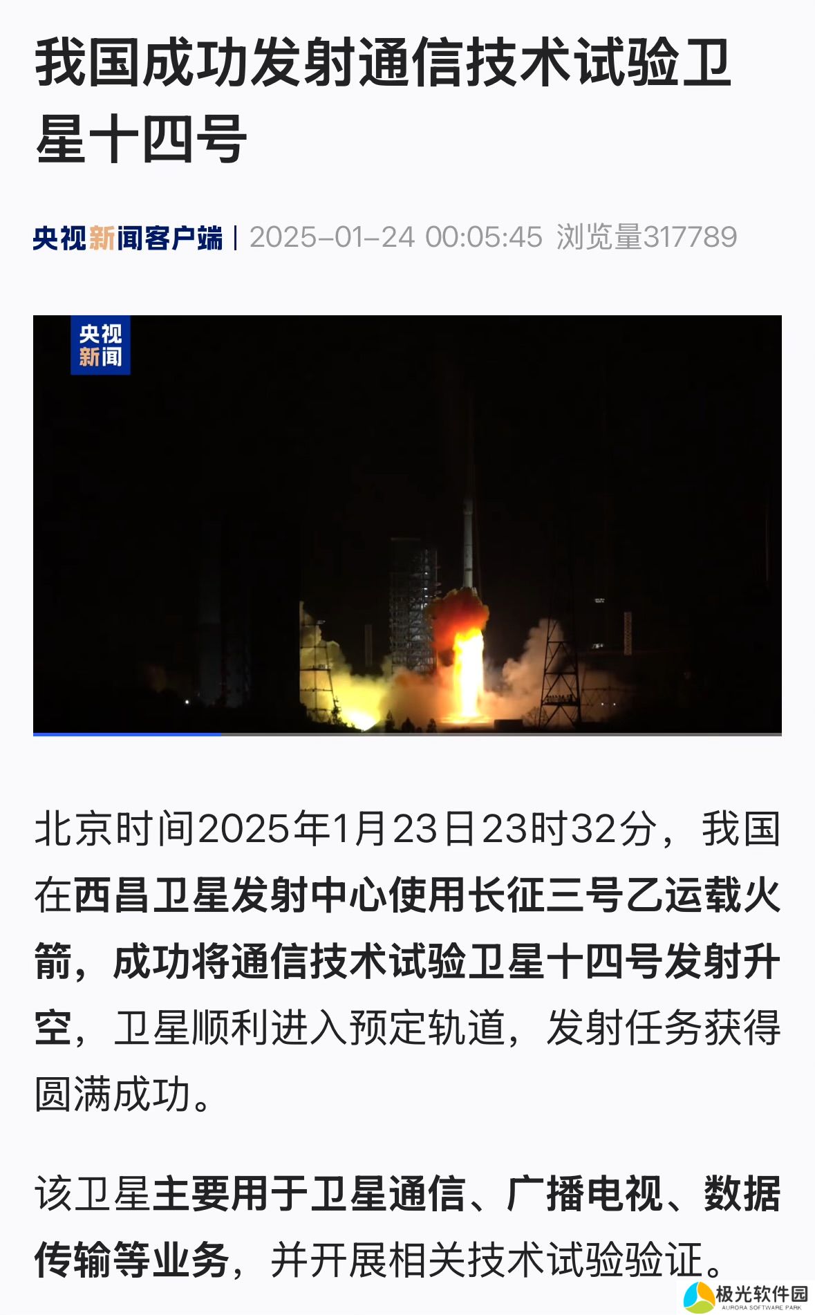 本站 1 月 24 日消息,1 月 23 日 23 时 32 分,我国在西昌卫星发射中心使用长征三号乙运载火箭,成功将通信技术试验卫星十四号发射升空,卫星顺利进入预定轨道,发射任务获得**成功。这次任务是长征系列运载火箭的第 558 次飞行。