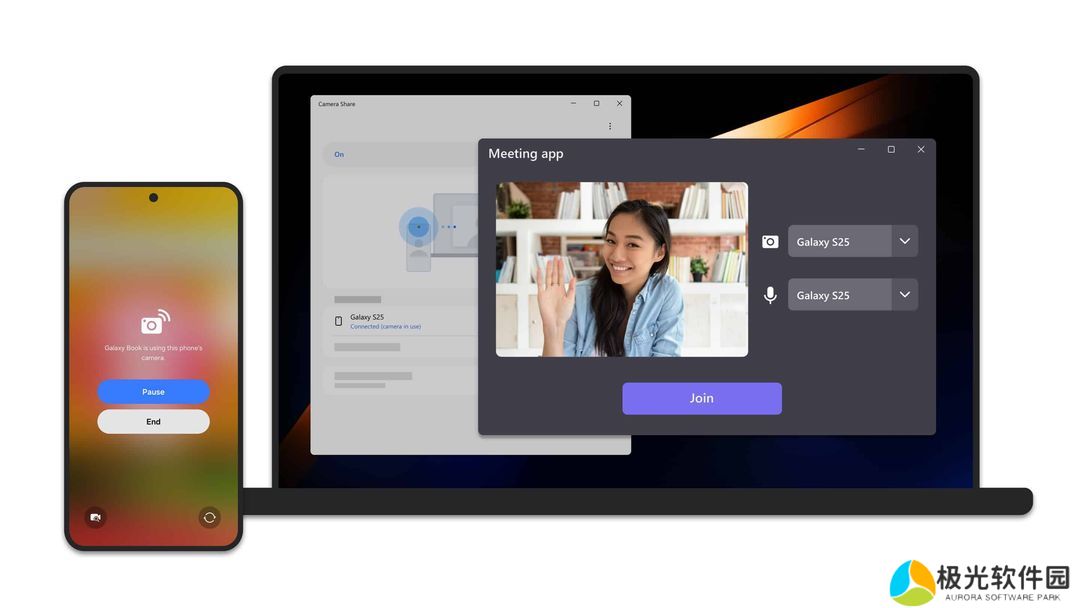 三星更新了 Microsoft Store 上的 Camera Share 应用,在最新上传的 2 张截图中,显示 Galaxy S25 作为 Galaxy Book 网络摄像头,表明随着发布日期临近,三星不再回避命名或展示未发布的旗舰产品。