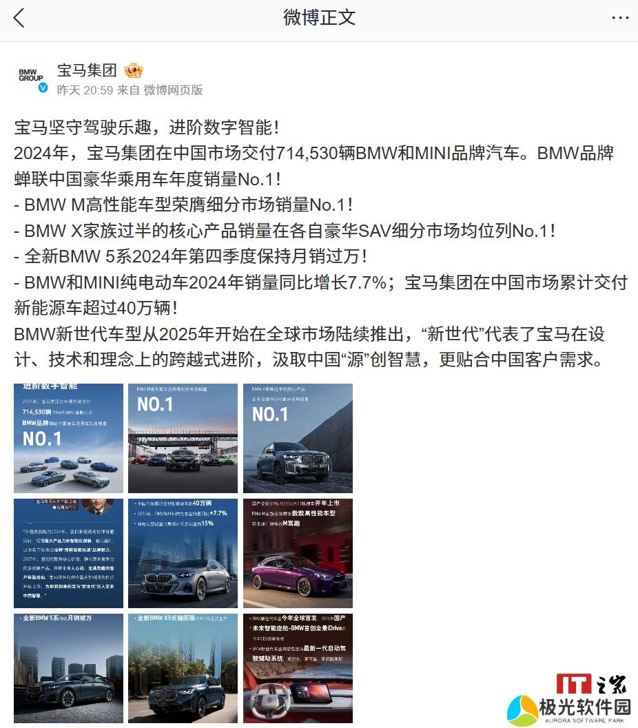 本站 1 月 14 日消息,宝马集团昨日发文宣布,2024 年在中国市场交付 714,530 辆 BMW 和 MINI 品牌汽车,BMW 品牌蝉联中国豪华乘用车年度销量 No.1。官方公布相关成就如下: