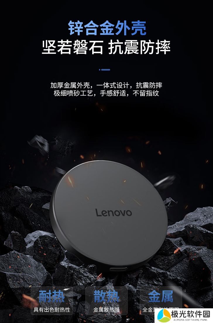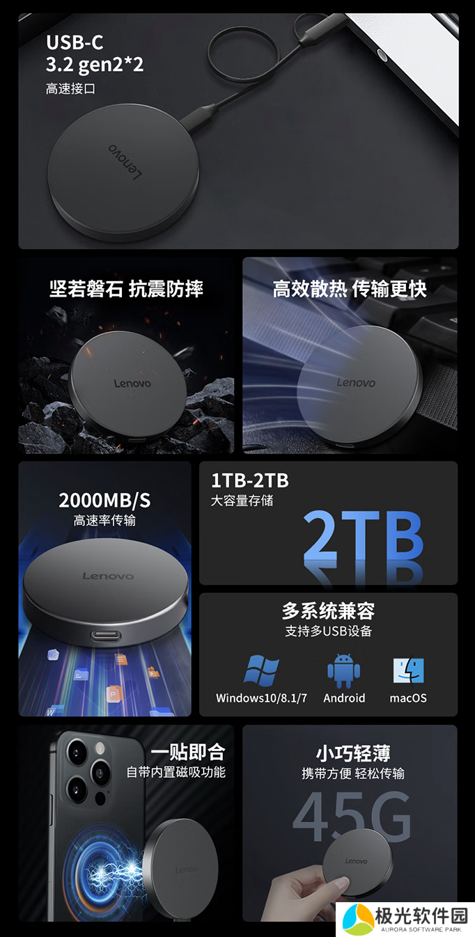 联想 Y910 磁吸移动固态硬盘使用圆形外观 + 锌合金外壳 + 哑光黑配色设计,重约 45g,内置磁吸功能。硬盘配备配 USB-C 3.2 Gen2*2接口,支持1800-2000 MB/s 读速、1700-1900MB/s 写速。