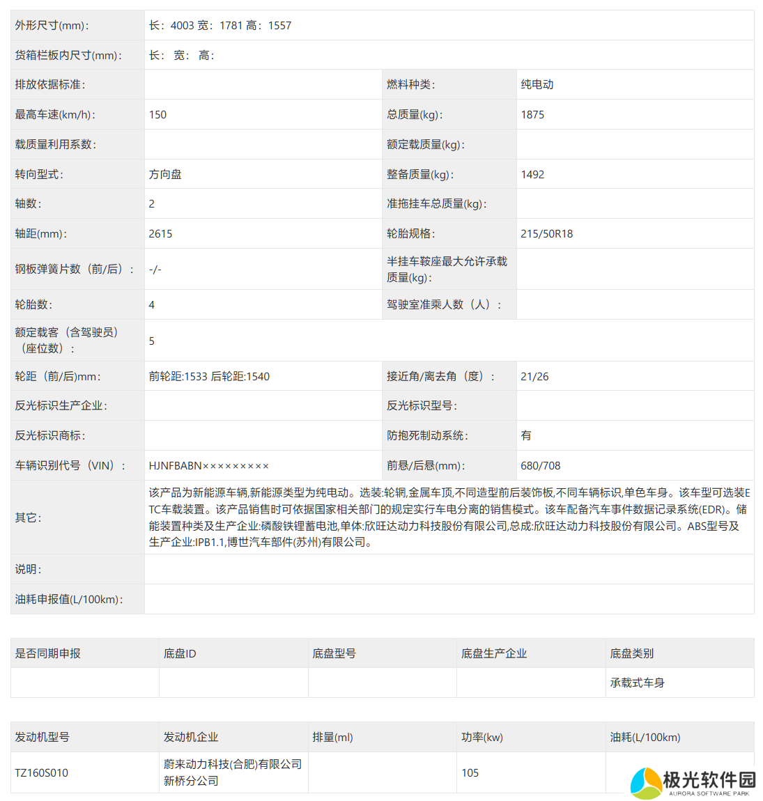 新车长 4003mm,宽 1781mm,高 1557mm,轴距来到了 2615mm,整备质量 1492kg,电机最大功率 105kW,最高车速 150km/h,搭载磷酸铁锂电池(欣旺达生产),并配备 ABS(博世生产)和 EDR 系统。