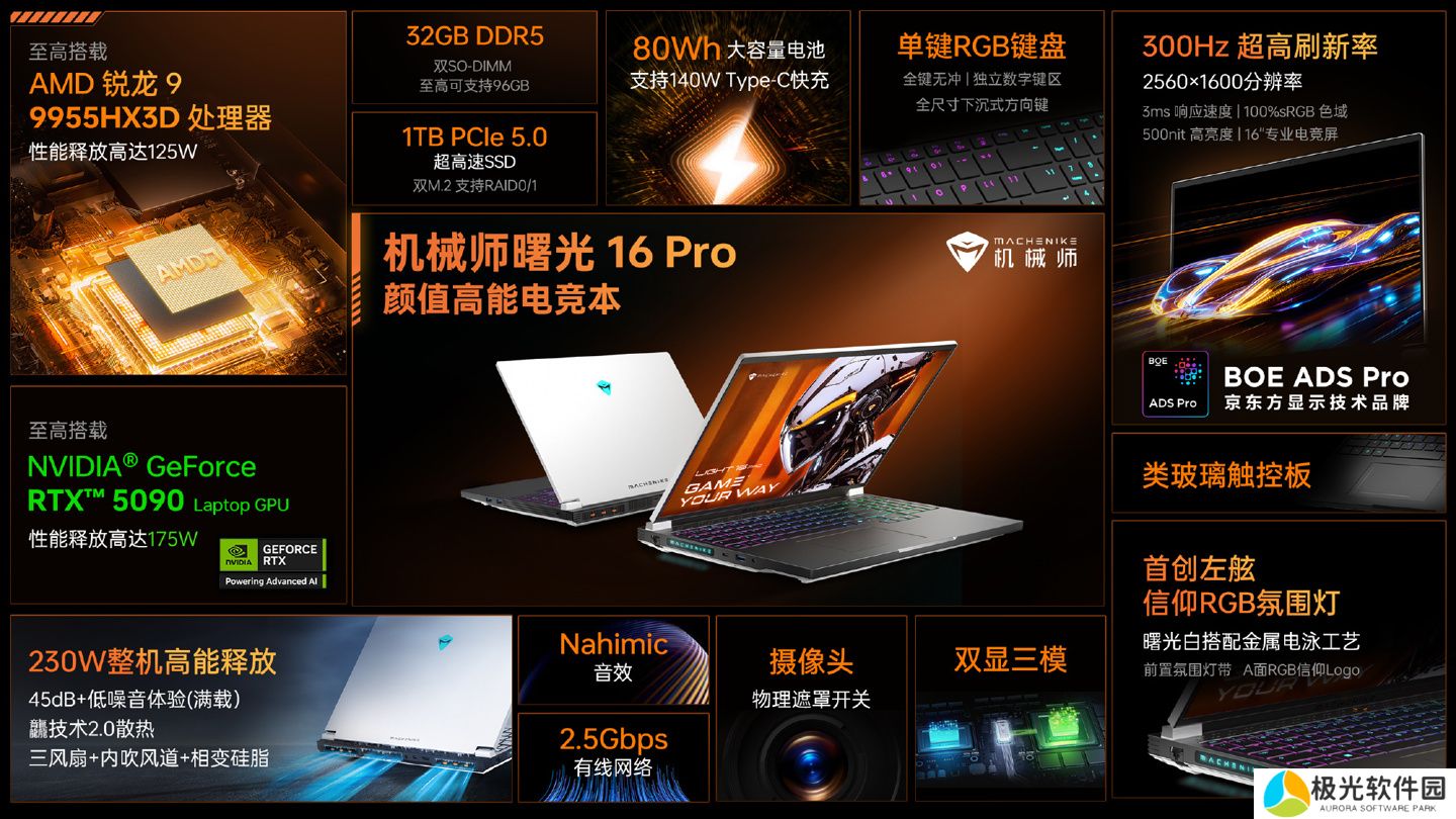 本站从官方海报获悉,2025 款曙光 16 Pro 至高搭载 AMD 锐龙 9 9955HX3D 处理器,性能释放达 125W;至高搭载 NVIDIA GeForce RTX 5090 Laptop GPU,性能释放达 175W;整机性能释放 230W,支持 45dB + 低噪音体验(满载),三风扇 + 内吹风道 + 相变硅脂。
