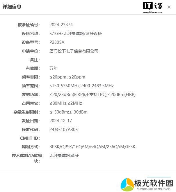 本站 12 月 21 日消息,刚发布 G97、ZS99 两款相机,松下本周又注册了一款新品,型号为“P2305A”,支持 5.1GHz 双频无线网络,但关于该机的具体型号和参数规格目前我们尚不得而知。