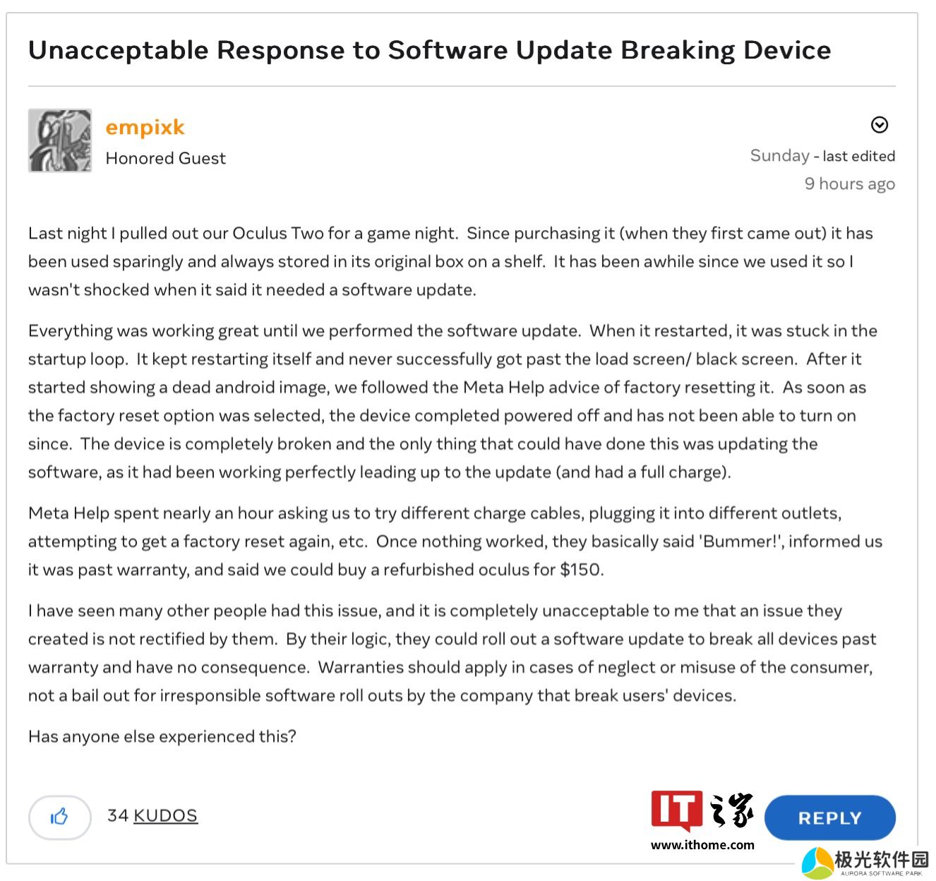 而目前Meta 的 Quest 与 Horizon OS 副总裁 Mark Rabkin 在X平台发文,对这一头显变砖问题进行解释。
