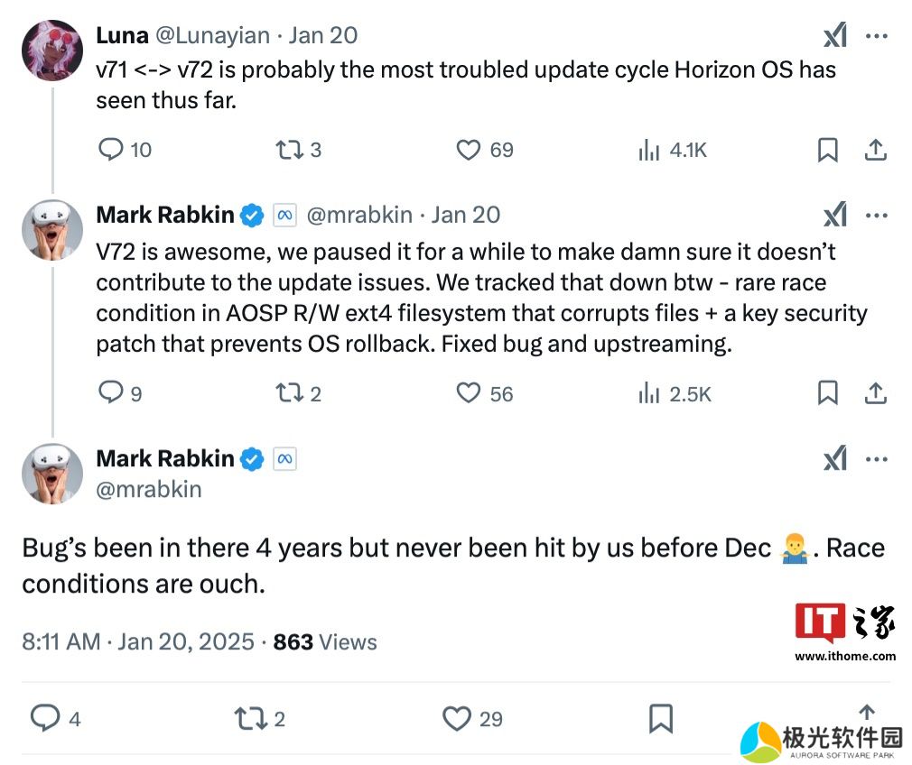 据其介绍,Meta Quest头显的 Horizon OS 基于 Android 开放源码项目(AOSP)打造,其中的 ext4 文件系统在系统更新时触发了罕见的“竞争条件(racecondition)”错误,也就是多个进程同时读写同一资源,导致系统底层损坏,而头显又限制了系统回滚功能,从而导致相应设备受到不可逆的损坏。