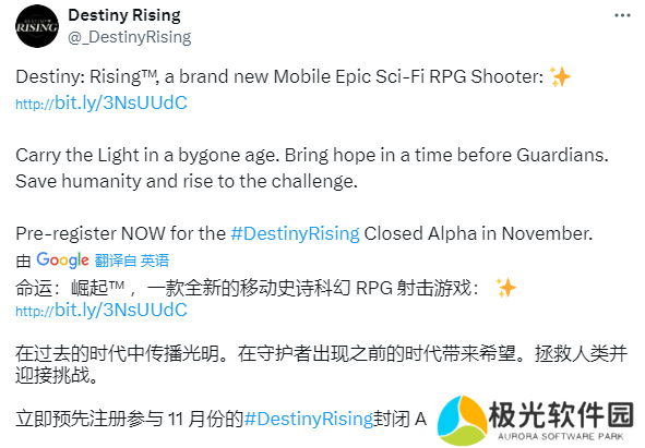 近日,网易与Bungie联合宣布,《命运:崛起(Destiny Rising)》游戏将于11月1日在海外启动Alpha测试,具体测试时间尚未确定。本次测试将面向美国和加拿大的玩家开放,测试资格将从官网预约用户中随机抽取。